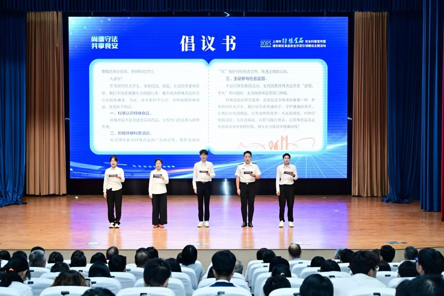 来自上海海洋大学、上海海事大学、上海电力大学、上海电机学院、上海建桥学院五所高等院校学生代表发出倡议,号召青年群体成为特殊食品安全“宣传员”“监督员”,现场 200 余名师生共同响应,为食安共治注入青春力量。